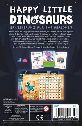 Mit der 5–6 Spieler Erweiterung zu Happy Little Dinosaurs könnt ihr das beliebte Katastrophenspiel nun auch in größerer Runde genießen. Zwei neue Dinos, neue Katastrophen und doppelt so viel Schaden – perfekt für Partys und gesellige Runden.