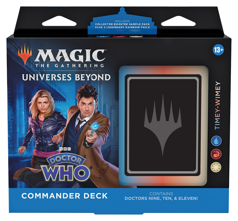 Erlebe Zeitreisen, verrückte Abenteuer und ikonische Charaktere mit dem Timey-Wimey Commander Deck aus der Magic: The Gathering Universes Beyond-Reihe. Dieses spielfertige 100-Karten-Deck bringt die Welt des zehnten und elften Doctors auf deinen Spieltisch – mit einzigartigen Mechaniken wie Zeitreise, Sagas und Paradoxa.